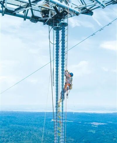 位于江苏省淮安市的1000千伏淮盱Ⅱ线检修现场,江苏省送变电有限公司检修人员对复合绝缘子进行更换作业。史 俊摄(人民视觉)