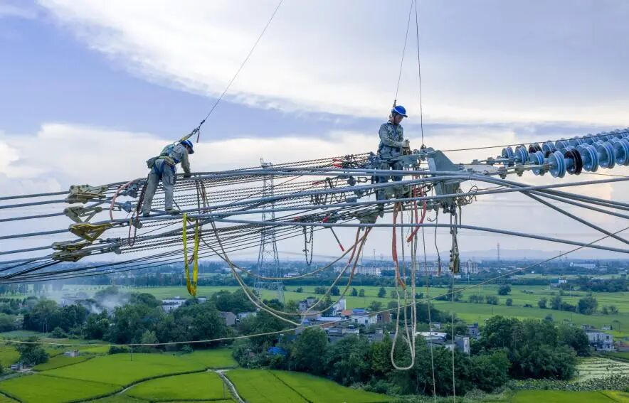 ▲近日,甘肃至浙江±800千伏特高压直流输电工程安徽段进入架线施工阶段。图为在安徽省芜湖市南陵县,安徽送变电工程有限公司施工人员在高空进行架线施工