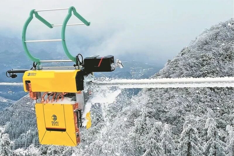▲除冰机器人在电力线路上开展除冰作业